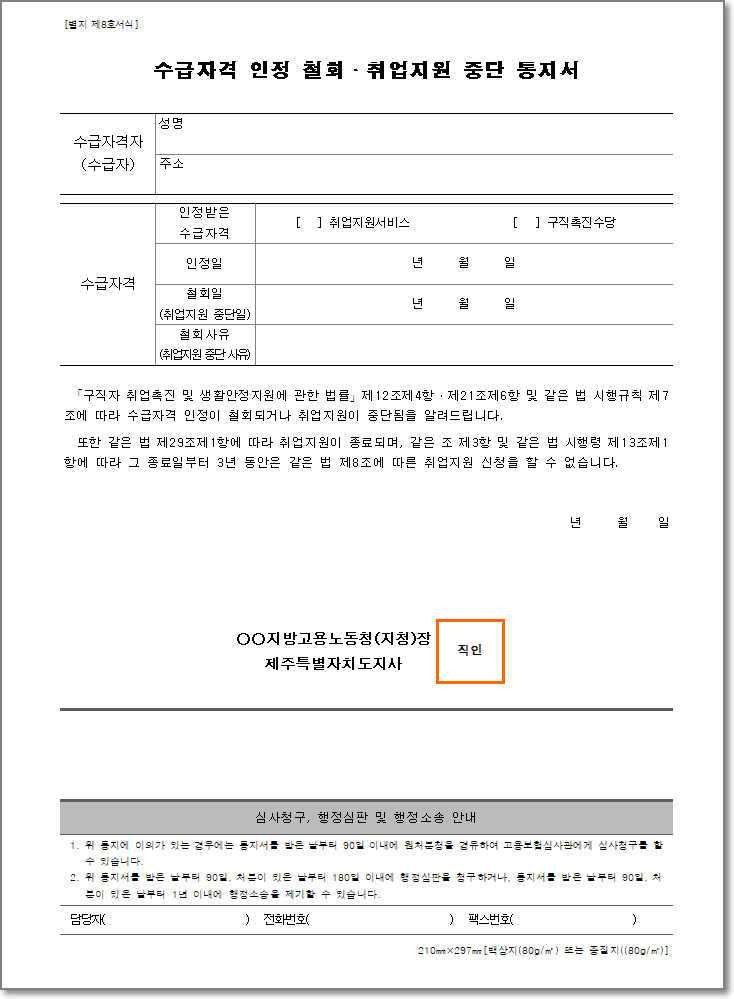 수급자격 인정 철회 취업지원 중단 통지서