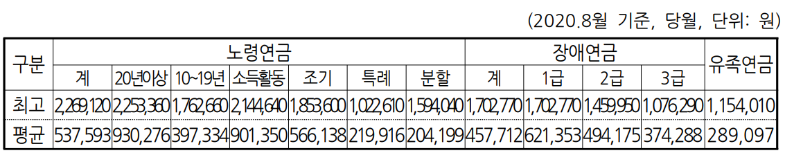 국민연금 급여종류별 지급액(2020년기준)