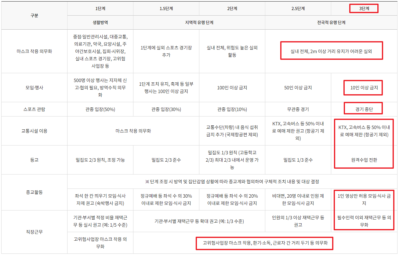 일상 및 사회.경제적 활동역시 3단계가 되면 실내전체와 2미터 이상 거리두기 어려운 실외 모두 마스크를 의무적으로 착용해야 하며, 모임행사는 10인 이상 금지됩니다.(결혼식,장례식 등) 스포츠는 경기중단이 되며 교통시설은 항공기를 제외하고는 KTX와 고속버스는 50%이내로 예매를 제한하게 되며, 학교는 100% 원격수업으로 전환하고 종교활동 역시 영상만 허용하며 모임.식사.금지 됩니다. 또한 직장근무도 필수인력을 제외하고는 모두 재택근무를 의무적으로 해야 합니다.