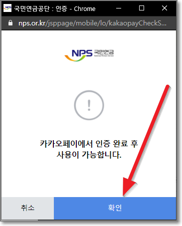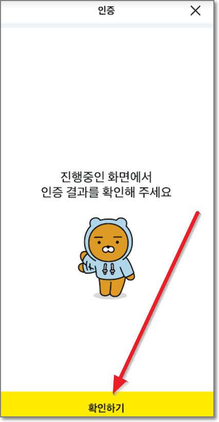 그럼 아래처럼 "진행중인 화면에서 인증 결과를 확인해주세요"라고 나오는데요. 우선 노란색 "확인하기"를 누르고 다시 PC로 돌아갑니다.