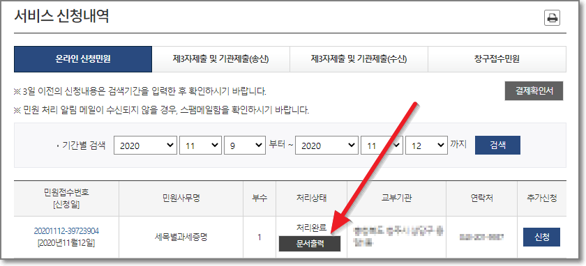 잠시 기다리면 서비스 신청내역에 방금 신청한 "세목별과세증명" 이 보이고, 이 상태에서 "문서출력"을 누르면 됩니다.