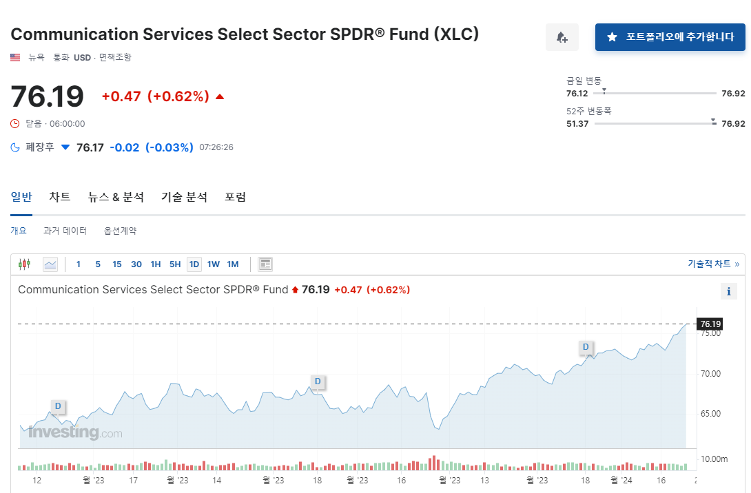 트럼프의 대선 출마 가능성이 높아짐에 따라, '트럼프 관련주'라 불리는 테마주들이 주목받고 있습니다. 에너지 섹터 ETF인 XLE와 함께, 소셜 미디어 관련주도 주목할 만합니다. 특히 트럼프가 관련된 SNS 기업과 합병을 추진하는 '디지털월드애퀴지션'은 최근 큰 폭의 상승세를 보였습니다. 반면, 메타와 구글을 포함하는 XLC ETF는 안정적인 상승세를 유지하고 있습니다.