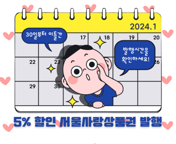 설 연휴를 맞아 서울시민들에게 특별한 소식이 있습니다. 서울시에서는 한파만큼이나 얼어붙은 경제 사정을 조금이나마 녹이고자, 총 1,000억 원 규모의 '서울사랑상품권'을 특별 발행하며 5%의 할인 혜택을 제공합니다. 50만원이 한도이며 5% 할인혜택이 있으므로 50만원을 충전하면 525,000원을 사용할 수 있는 것입니다.
