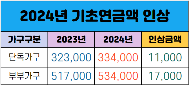 올해 단독가구의 기초연금은 월 334,000원, 부부가구는 월 534,000원으로 조정되었습니다. 이는 2023년 대비 단독가구 11,000원, 부부가구 17,000원이 증가한 금액입니다.