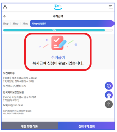 수고하셨습니다. 이제 '주거급여' 신청이 완료되었습니다. 아래쪽의 '신청내역 조회'를 누르면 주거급여 신청한 내역을 확인해보실 수 있습니다.