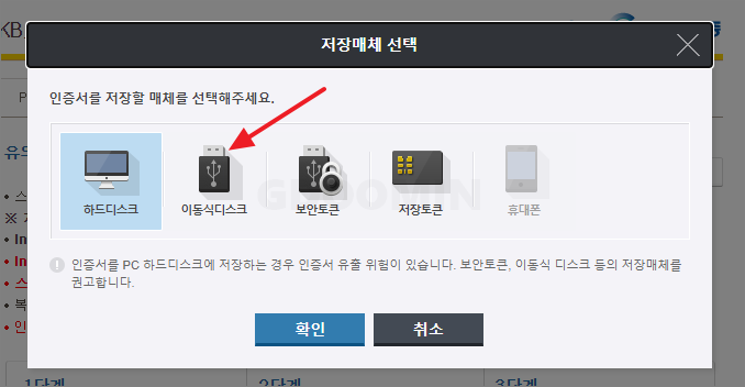 인증서를 이동하면 인증서를 저장할 매체를 선택하라고 하는데요. USB가 없다면 하드디스크에, USB(이동식디스크)가 있다면 '이동식디스크'를 선택해주시면 됩니다.
