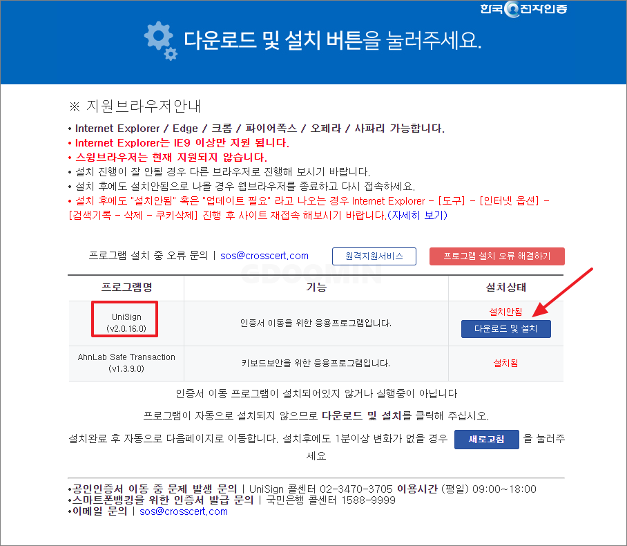 왠만하면 UniSign이 설치가 안되어있을 것입니다. 위 화면처럼 '다운로드 몇 설치'를 눌러서 UniSign을 설치합니다.