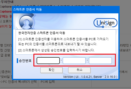 위 화면처럼 UniSign의 스마트폰 인증서 이동 창이 나오고 승인번호를 입력하라고 합니다.