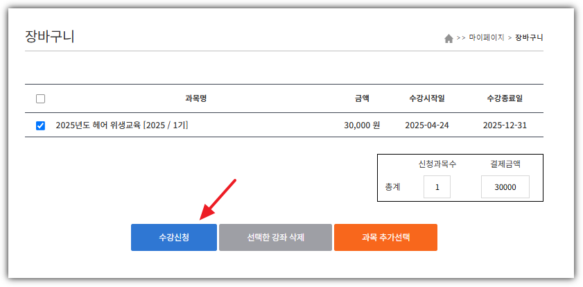 수강신청과 결제 과정은 간단한 편인데요. 회원가입 후 수강신청을 하시고 결제를 진행하시면 됩니다. 결제 시에 장바구니 오류가 발생할 수 있으므로 반드시 크롬(chrome)이나 엣지 브라우저를 사용하세요.