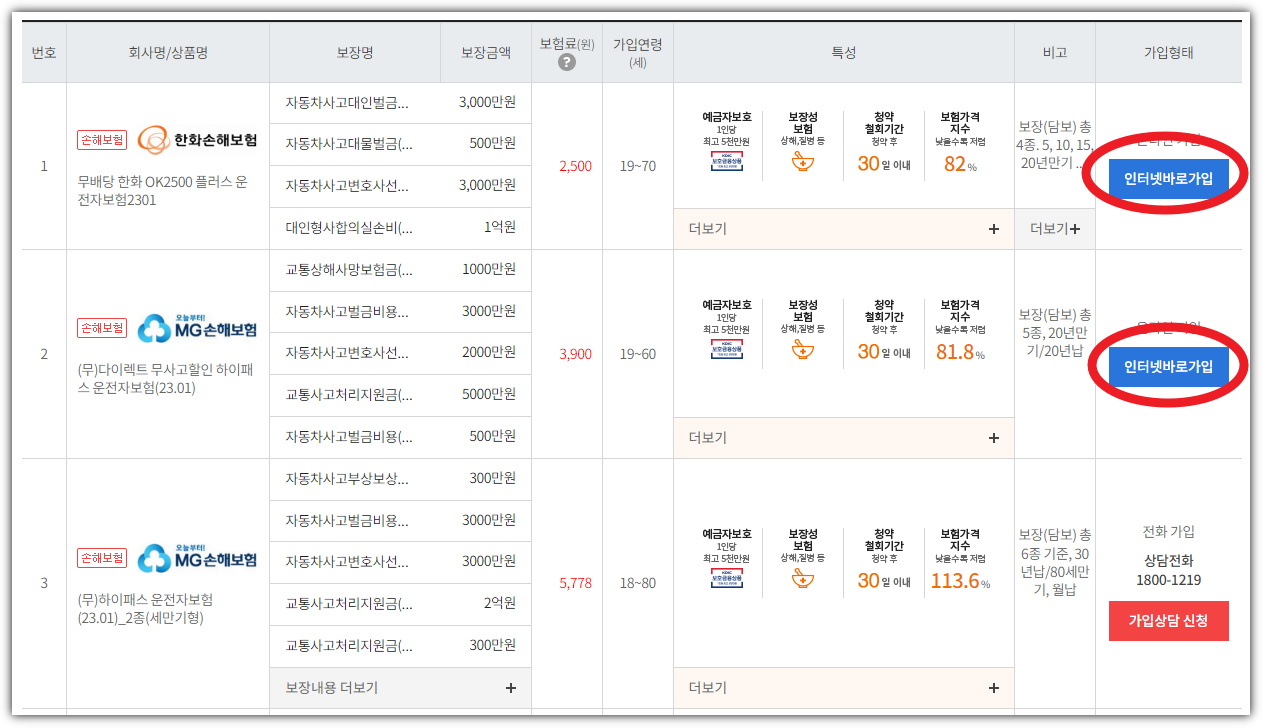 그럼 다양한 보험이 나오는 걸 확인하실 수 있습니다. 사실 운전자 보험에 교통사고부상 치료비, 사망 등 다양한 담보를 추가하실 수 있습니다.
