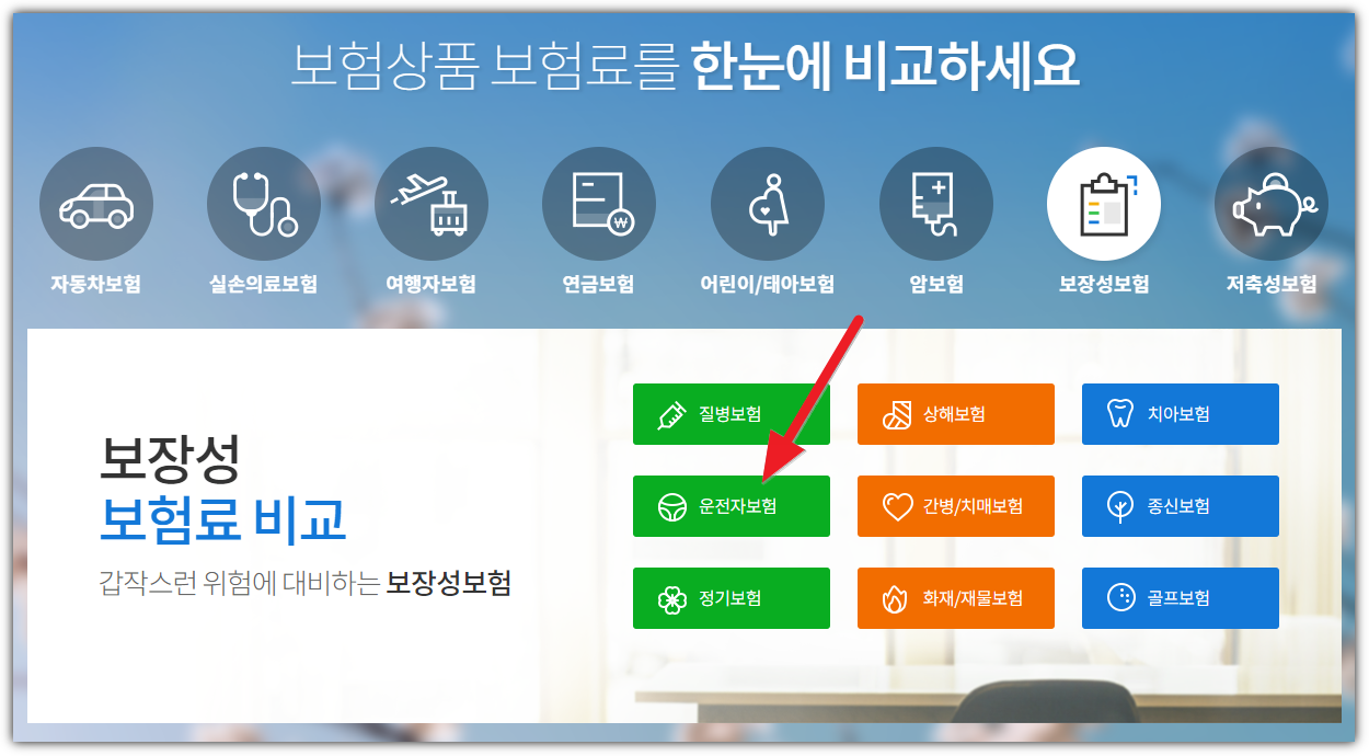 ▶보험 다모아 사이트 접속 > 보장성보험 > 운전자보험 클릭