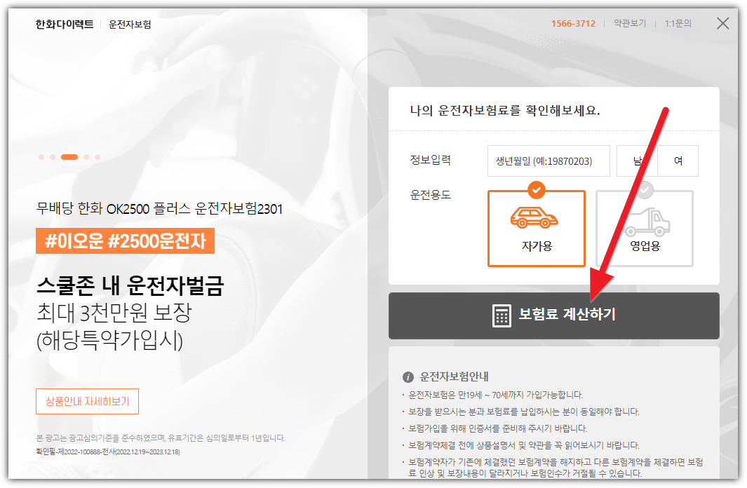 ▶ 정보입력 > 성별 선택 > 운전용도 선택 > 보험료 계산하기