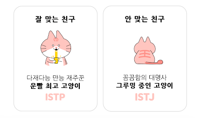 잘 맞는 친구로는 다재다능만능 재주꾼, 운빨 최고 고양이인 ISTP가 나왔고