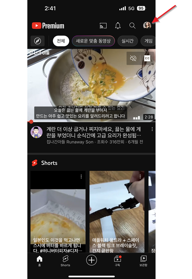 1. 유튜브 앱을 실행하고 앱 우측상단에 있는 자신의 프로필아이콘을 선택합니다.