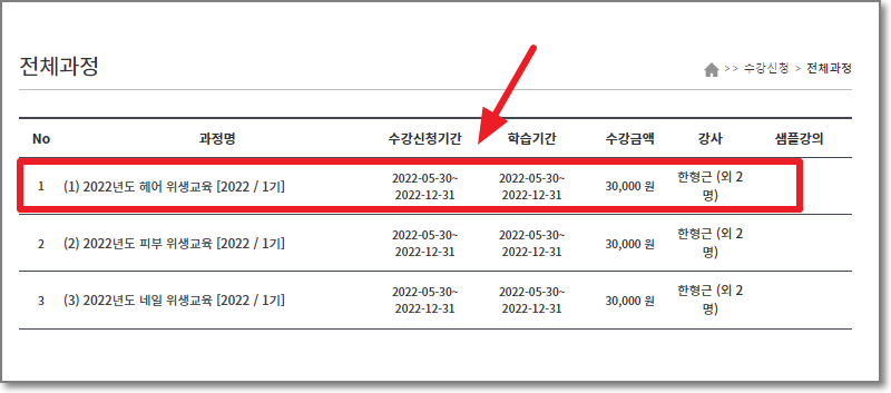 2022년도 헤어 위생교육 2022/1기 우측에 있는 '수강신청'을 누릅니다.