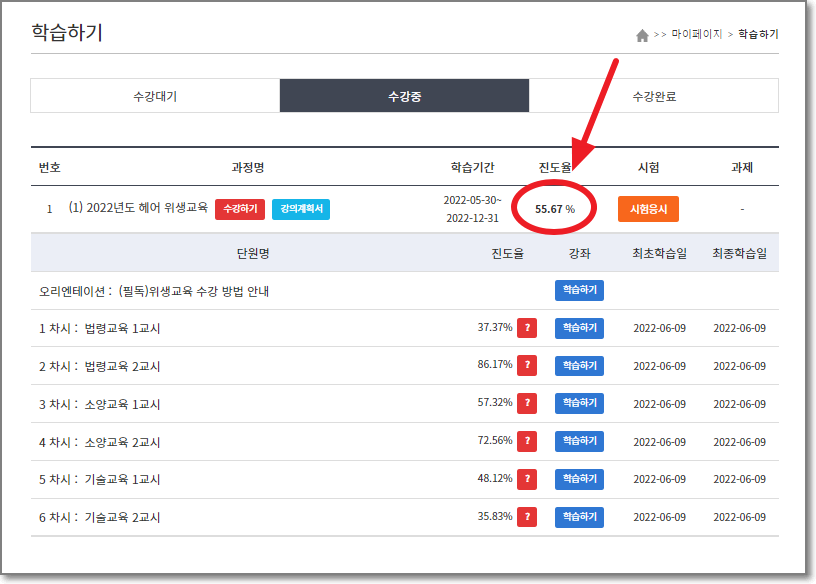 아래 보이는 진도율이 100%가 되면 시험을 응시할 수 있습니다.