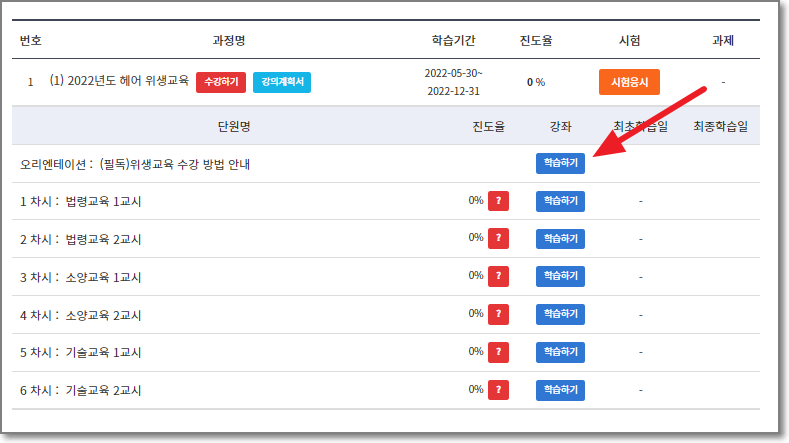 '수강하기'를 누르면 펼쳐지는 1차시부터 6차시(오리엔테이션 별도)까지 '학습하기'를 누릅니다.
