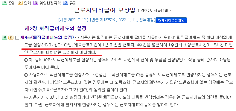 * 과거에 2010년 12월1일 이전에는 상시근로자 5인 미만의 사업장은 퇴직금 지급의무가 없었습니다. 하지만 2010년 12월1일부터 근로자수와 무관하게 퇴직금을 지급하게 개정되었고 2012년 12월31일까지는 법정퇴직금의 50%만 지급하도록 유예기간을 두었습니다. 따라서 2013년 1월1일부터는 근로자수와 관계없이 1인 사업장도 퇴직금 지급의무가 있습니다.