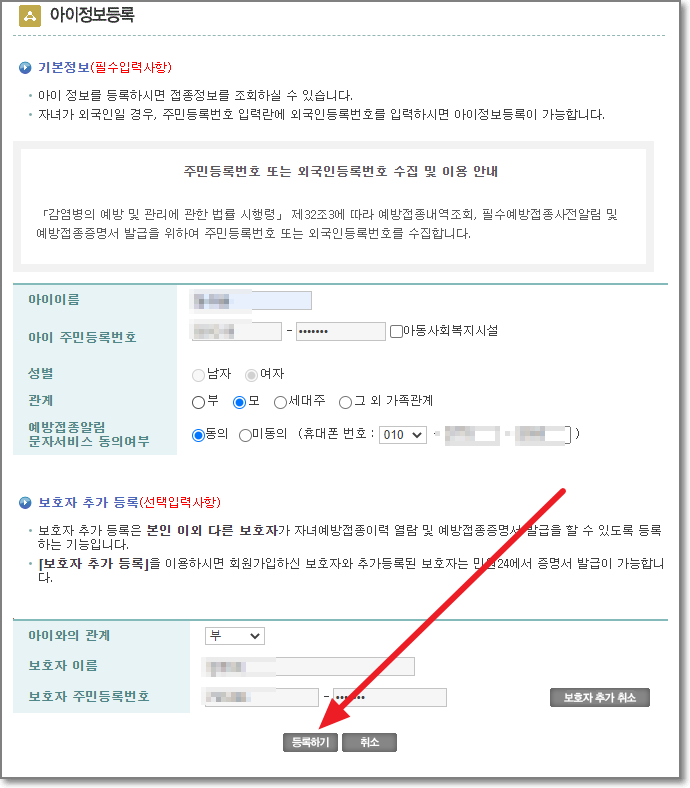 추가할 보호자 이름과 주민등록번호를 입력하고 "등록하기"를 누릅니다.
