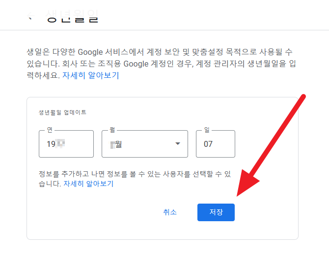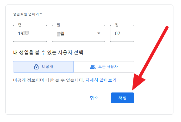 생년월일은 비공개가 원칙입니다. "저장"을 누릅니다.