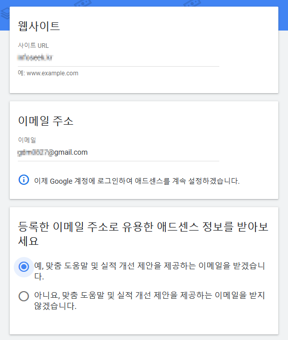 위에부터 차례로 "티스토리 블로그 주소", "구글 이메일 주소", 그리고 정보성이메일을 받는다고 클릭하고 아래에 있는 저장하고 계속하기를 누릅니다.