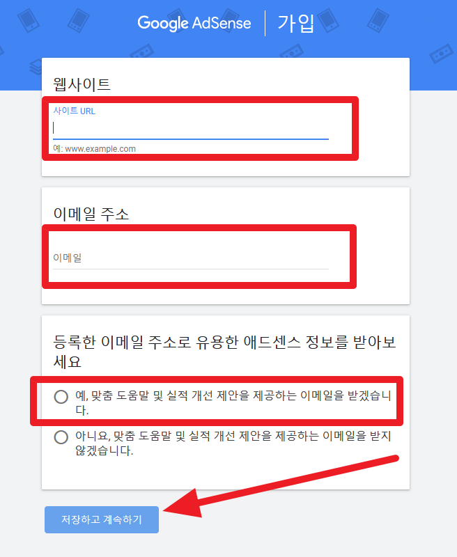 다시 애드센스 신청페이지로 돌아와서 다시 아래사항을 채우고 "저장하고 계속하기"를 누릅니다.