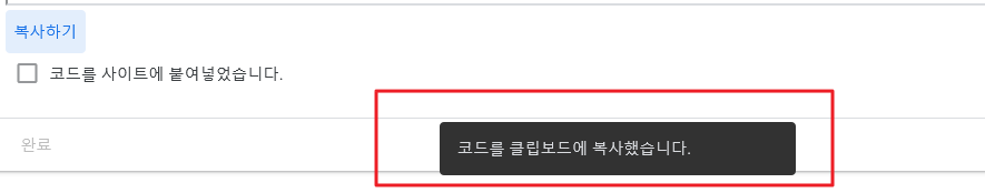 이제 다시 구글 애드센스로 돌아와서 (아까 닫으면 안된다고 했습니다.) 다음과 같이 복사하기 밑에 코드를 사이트에 붙였습니다. 앞에 체크를 하고 "완료"를 누릅니다.