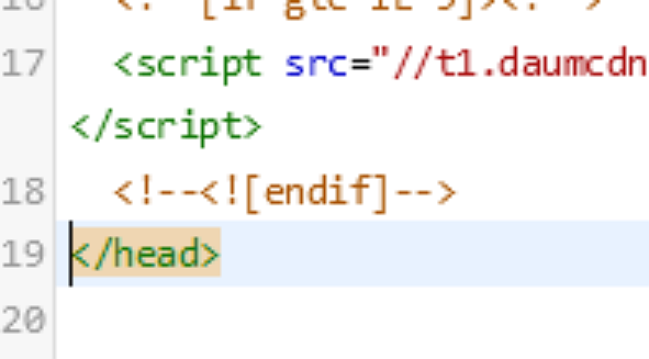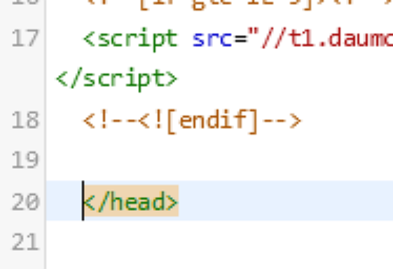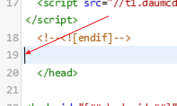 그럼 아래처럼 코드나 나오는데요. 어려울거 없습니다. 박스친것처럼 <head>와 </head>가 있는데요. 여기서 </head>앞에 마우스를 한번 클릭합니다.