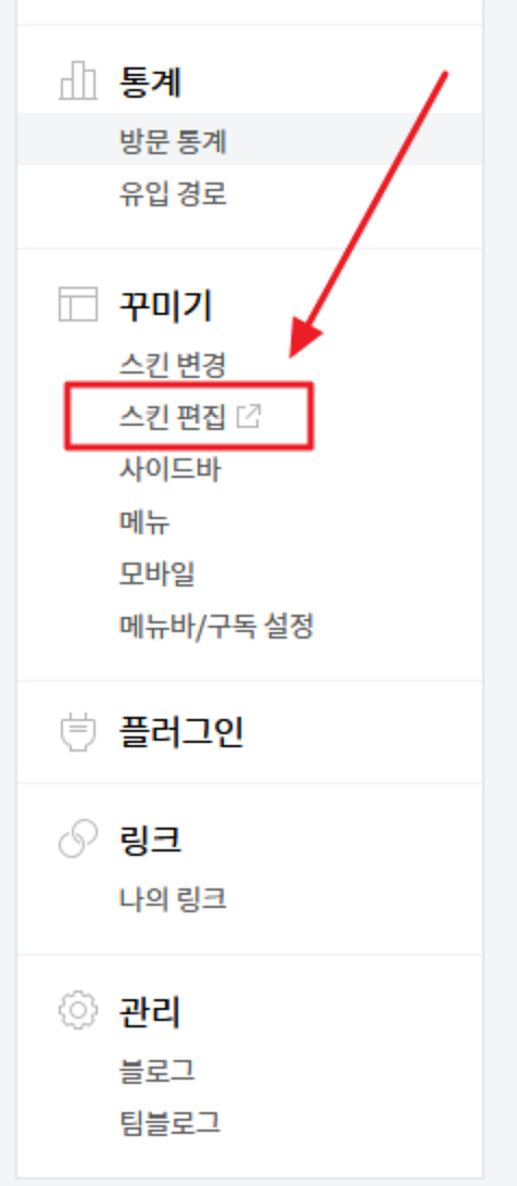 혹시 모르니까 현재창을 닫고 다시 블로그 관리메뉴에서 "스킨편집"을 눌러서