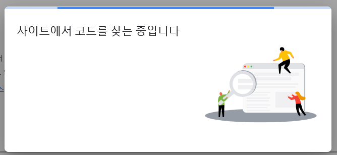 완료를 누르면, 코드를 잘 붙여넣었는지 구글에서 확인을 합니다. "사이트에서 코드를 찾는 중입니다"라는군요.