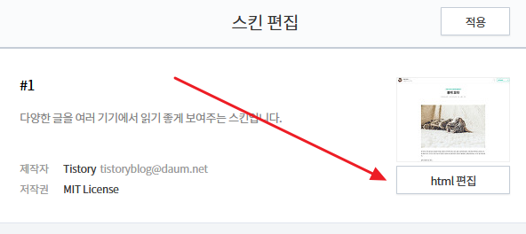 그리고 오른쪽 상단에 있는 "스킨편집"구역에서 "html편집"을 누릅니다.