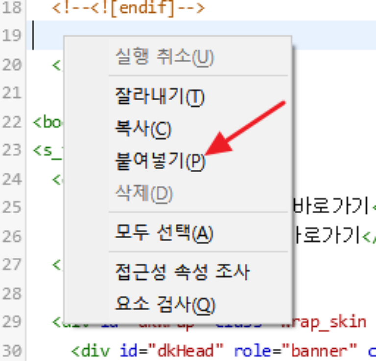 그대로 그자리에서 마우스 오른쪽 버튼을 클릭하면 아래처럼 메뉴가 뜨는데요. 여기서 "붙여넣기"를 왼쪽 버튼으로 누릅니다.