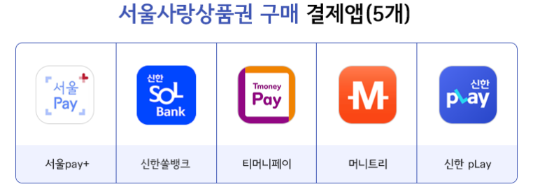 - 상품권 앱: 서울페이플러스(서울pay+), 신한쏠뱅크, 티머니페이, 머니트리, 신한쏠페이 등 5개 앱에서 구매 가능