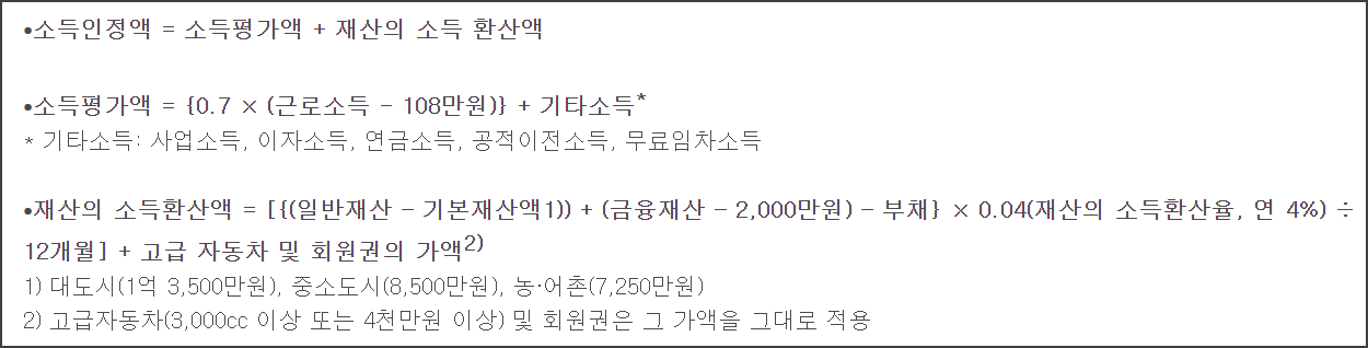 소득인정액은 근로소득, 연금소득 등을 포함한 총 소득과 재산을 합산한 금액입니다. 예를 들어, 단독가구가 월 200만원의 근로소득과 월 30만원의 국민연금을 받는 경우, 월 소득평가액은 약 94.4만원이 됩니다.