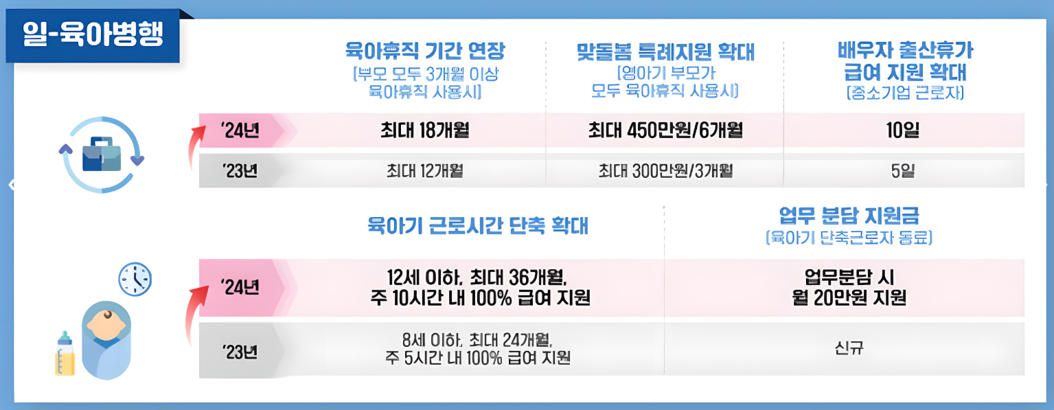 정부는 육아휴직 기간을 18개월로 늘리는 입법 추진 중입니다. 이에 따라 출산 근로자의 휴가는 최대 21개월로 늘어나며, 출산전후휴가급여와 육아휴직급여를 합쳐 최대 3330만원까지 지원받을 수 있을 전망입니다.