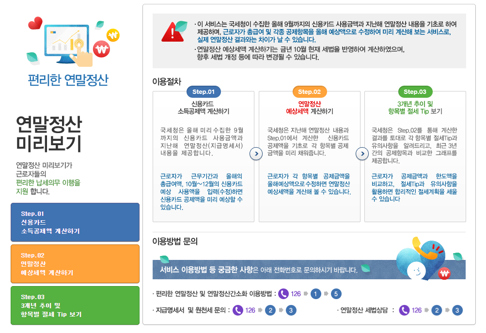 국세청에서는 연말정산 미리보기 서비스를 제공하여 지출과 저축 상황을 점검하고 최선의 절세 방법을 찾을 수 있습니다. 개인별로 어떻게 소득 공제를 받을지 모의 계산하여 세금 환급을 최대화할 수 있습니다. 홈택스에서 이 서비스를 이용해보세요.