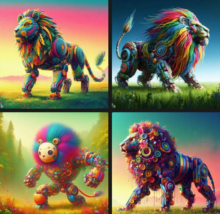 '초원의 다채로운 색깔의 사자를 닮은 로봇, 디지털 아트'라고 입력해보았습니다.