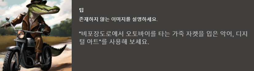 존재하지 않는 이미지를 '비포장도로에서 오토바이를 타는 가죽 자켓을 입은 악어, 디지털 아트'라고 치면 아래처럼 나옵니다.