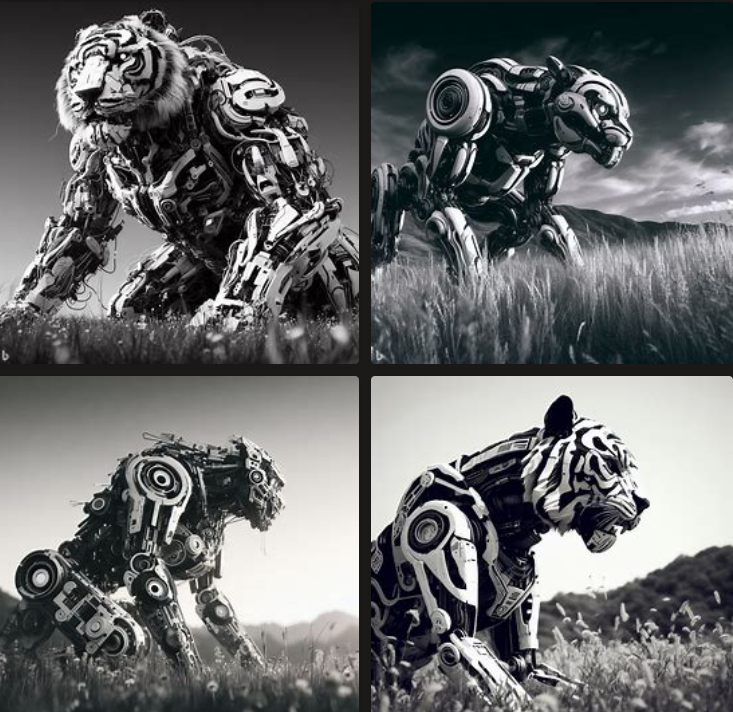 '초원의 흑백 색깔의 호랑이를 닮은 로봇, 디지털 아트'라고 입력해보았습니다.