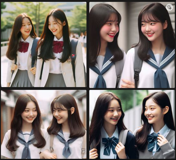 이번에는 '한국 여학생 두명이 웃으면서 대화하고 걸어가는 사진'이라고 입력해보았습니다.
