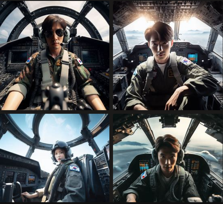 '전투기 조종석에 있는 한국인 조종사 사진 와이드샷'이라고 입력한 결과물은 아래와 같습니다.