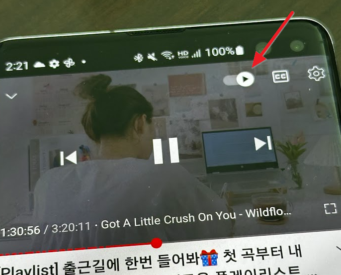 유튜브 앱 전체설정이 아닌 동영상 자체에서도 자동재생 항목이 있는데요. 동영상이 플레이되는 중에는 화면 내에 있는 컨트롤들이 사라지지만 화면을 한번 터치하면 잠시 보입니다. 플레이 화면을 터치하고 잘 보면 위에 아래 그림처럼 작은 플레이버튼이 있는 버튼이 있습니다. 이 부분이 오른쪽으로 가있고 플레이버튼 모양이 되어있으면 '자동재생'이 켜진 상태입니다.