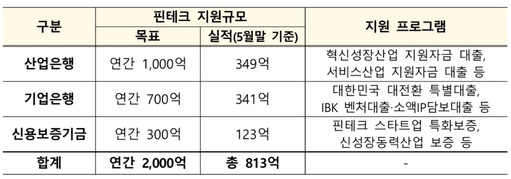 맞춤형 정책금융지원을 통한 자금애로 해소노력으로 정책금융기관의 핀테크 산업 지원현황은 아래의 표와 같습니다.