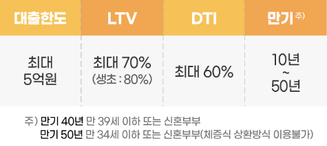 대출한도는 최대 5억원이며 LTV는 최대 70%입니다.(생애최초인 경우에는 80%) DTI는 최대 60%이며 만기는 10년에서 50년까지입니다. 만기는 나이로 구분하는데요. 40년 만기는 39세 이하 또는 신혼부부이며, 50년 만기는 34세 이하 또는 신혼부부로 이중에서 50년 만기는 체증식 상환방식이 이용불가하다는 점 유의해야 합니다.