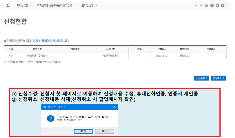 9. 학자금대출 > 학자금대출신용회복관리(장기연체)>온라인 신청 > 신청현황 확인