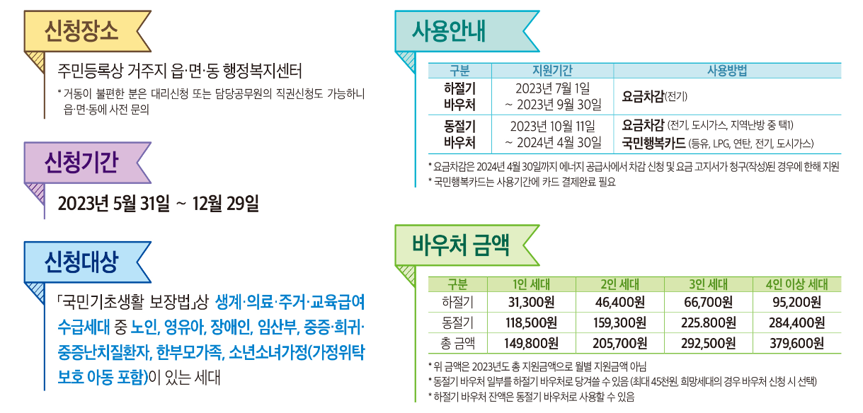 온라인신청 : 복지로(www.bokjiro.go.kr)를 통한 온라인 신청 (복지로 접속 > 상단 메뉴 중 "서비스 신청" 클릭 > "복지서비스 신청" 클릭 > 에너지바우처 선택)