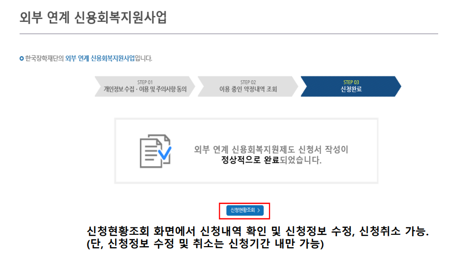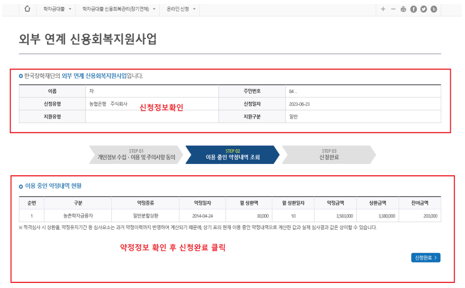 9. 학자금대출 > 학자금대출신용회복관리(장기연체)>온라인 신청 > 신청현황 확인