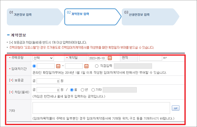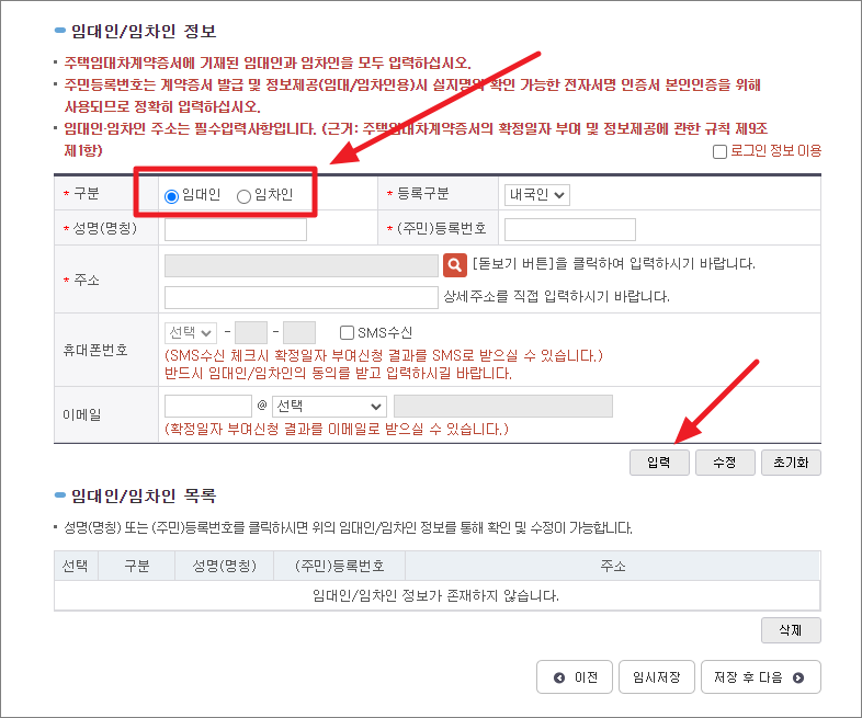 임대인/임차인 정보에는 임대인과 임차인 모두 입력해야 합니다.계약서 내용을 보고 그대로 입력합니다.