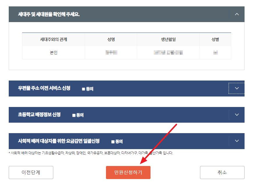 세대주를 확인하고 아래 있는 우편물 주소 이전 서비스, 초등학교 배정정보 신청, 사회적 배려 대상자(기초수급자, 차상위, 장애인, 국가유공자, 보훈대상자, 다자녀가구, 대가족 출산가족) 등 필요한 경우 동의에 체크하고 "민원신청하기"를 누릅니다.