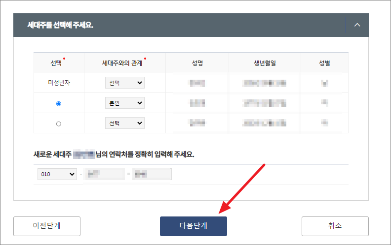 남은 가족이 있다면 새롭게 세대주를 지정해서 연락처 입력 후 다음단계를 누릅니다.
